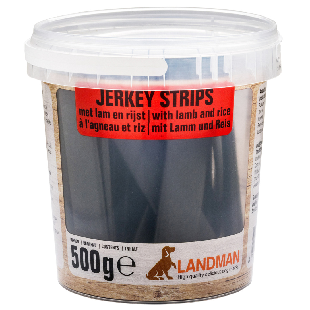 Landman Jerkey Lamb/rice Strips (USA) zijn hondensnacks van vlees en dierlijke bijproducten, plantaardige bijproducten, granen, dextrose, mineralen, EU toegestane anti-oxydanten en conserveringsmiddelen. Makkelijk in stukjes te breken dus ook handig voor training. Glutenvrij.