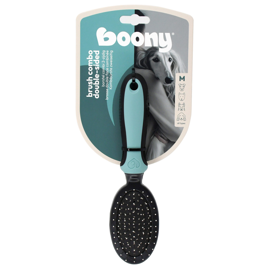 Met deze praktische Boony 2-zijdige combi-borstel heb je twee essentiële borstels in één handig product. Ideaal voor hondenbezitters die gemak, effectiviteit en veelzijdigheid zoeken. De borstel combineert een nylon zijde voor het verwijderen van vuil en een stalen zijde voor het losmaken van dode en losse haren.