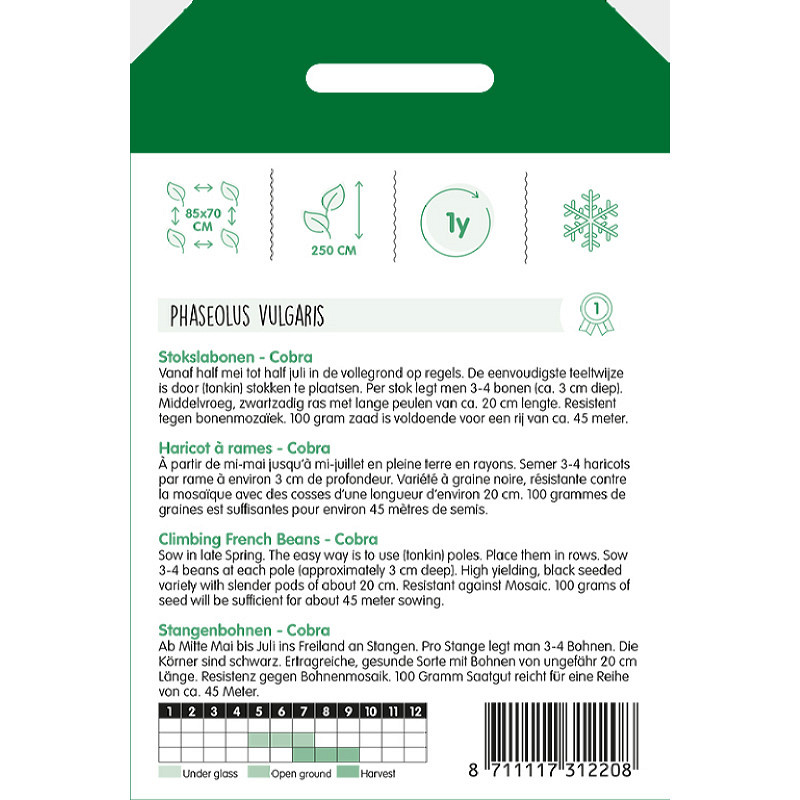 Zaaien vanaf half mei tot half juli in de vollegrond op regels. De eenvoudigste teeltwijze is door (tonkin) stokken te plaatsen. Per stok legt men 3-4 bonen (ca. 3 cm diep). Middelvroeg, zwartzadig ras met lange peulen van ca. 20 cm lengte. Resistent tegen bonenmozaïek.