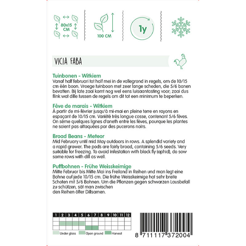 Vanaf half februari tot half mei in de vollegrond in regels, om de 10/15 cm één boon. Vroege tuinboon met zeer lange scheden, die 5/6 bonen bevatten. Bij late zaai komt nog wel eens luisaantasting voor; zaai dus flink wat dille tussen de regels om dit tot een minimum te beperken.